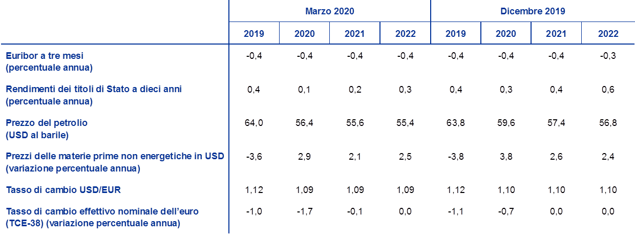 Gli andamenti di mercato recenti successivi alla data di chiusura di questo esercizio di proiezione implicherebbero una revisione significativa delle ipotesi tecniche: l’euro si è apprezzato, mentre i mercati finanziari e i prezzi del petrolio hanno registrato forti ribassi, di riflesso tra l’altro alla diffusione del COVID-19. Nel periodo recente l’euro si è rafforzato sul dollaro statunitense dopo l’inattesa riduzione dei tassi da parte della Federal Reserve; nei mercati del debito sovrano, i rendimenti di alcuni strumenti (quali i titoli di Stato tedeschi a dieci anni) hanno subìto un forte calo rispecchiando l’effetto congiunto dei timori per la crescita e della ricerca di investimenti più sicuri, mentre il differenziale rispetto ai rendimenti corrispondenti in altri paesi dell’area dell’euro si è notevolmente ampliato. Al tempo stesso i corsi petroliferi sono diminuiti in misura considerevole riflettendo non solo l’intensificarsi dei timori riguardo alle implicazioni per la crescita mondiale derivanti dalla diffusione del COVID-19, ma anche il recente disaccordo tra i partecipanti all’OPEC+.