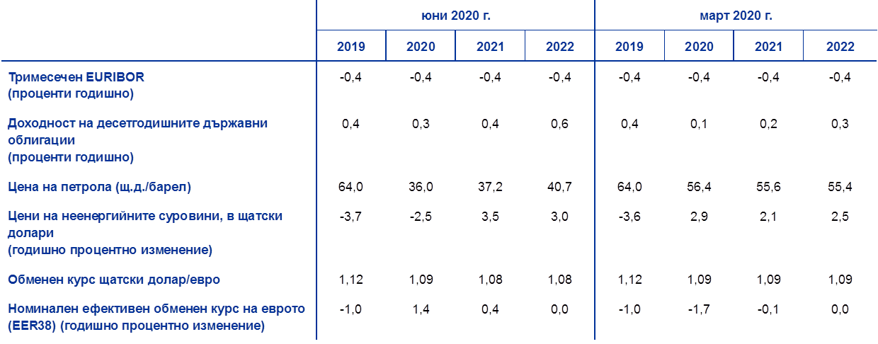 В сравнение с прогнозите на експертите на ЕЦБ от март 2020 г. техническите допускания включват значително по-ниски цени на петрола и на акциите, по-висок ефективен обменен курс на еврото и по-високи дългосрочни лихвени проценти. Техническите допускания за лихвените проценти и за цените на суровините се основават на пазарните очаквания към 18 май 2020 г. (крайна дата). Краткосрочните лихвени проценти се отнасят до тримесечния EURIBOR, като пазарните очаквания се извеждат от фючърсните лихви. Според тази методология средното равнище на краткосрочните лихвени проценти е -0,4% за целия прогнозен период. Пазарните очаквания за номиналната доходност на 10-годишните държавни облигации в еврозоната са за средно равнище от 0,3% през 2020 г., 0,4% през 2021 г. и 0,6% през 2022 г.[4] В сравнение с прогнозите на експертите на ЕЦБ от март 2020 г. пазарните очаквания за краткосрочните лихвени проценти остават като цяло непроменени, а номиналната доходност на 10-годишните държавни облигации в еврозоната е ревизирана нагоре с около 20 базисни пункта за периода 2020–2022 г.