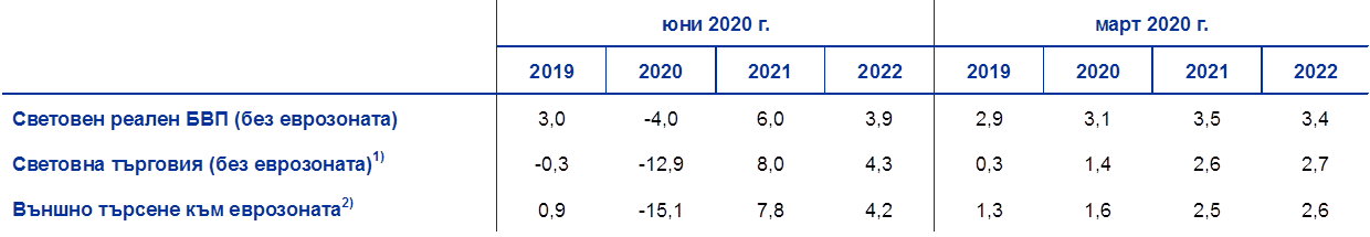 Подобни допускания за развитието на пандемията са в основата на международните прогнози, които сочат срив на външното търсене към еврозоната през 2020 г. Прогнозира се реалният БВП в световен мащаб (без еврозоната) да спадне с 4% през 2020 г., след което да отбележи нарастване с 6% през 2021 г. и с 3,9% през 2022 г. Световната търговия ще бъде по-неблагоприятно засегната от световния БВП, тъй като нарушената логистика и затворените граници засилват въздействието. Нещо повече, при икономически спадове динамиката на търговията има тенденцията да реагира по-силно на икономическата активност. В резултат на това се очаква външното търсене към еврозоната да спадне с 15,1% през 2020 г., а след това да нарасне със 7,8% и 4,2% съответно през 2021 г. и 2022 г.