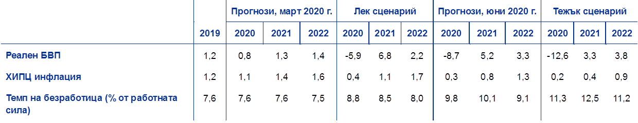 С оглед на безпрецедентната несигурност относно развитието на пандемията и нейното въздействие върху икономическото поведение, свързаните с нея ограничителни мерки и успеха на мерките по политиките, бяха изготвени два алтернативни сценария. В лекия сценарий сътресението се разглежда като временно, с бързо и успешно овладяване на вируса, което позволява бързо премахване на ограниченията. При този сценарий реалният БВП би намалял с 5,9% тази година, а през 2021 г. би последвало стремително възстановяване. До края на периода реалният БВП почти би достигнал нивото от прогнозите на експертите на ЕЦБ от март 2020 г. При този сценарий инфлацията би достигнала 1,7% до 2022 г. За разлика от това тежкият сценарий със силно ново нарастване на броя на заразените предполага по-строги ограничителни мерки, които значително възпрепятстват икономическата активност. При този сценарий реалният БВП спада с 12,6% през 2020 г., а към края на прогнозния период е с около 9½% под нивото от прогнозите на експертите на ЕЦБ от март 2020 г., с темп на инфлация едва 0,9% през 2022 г.