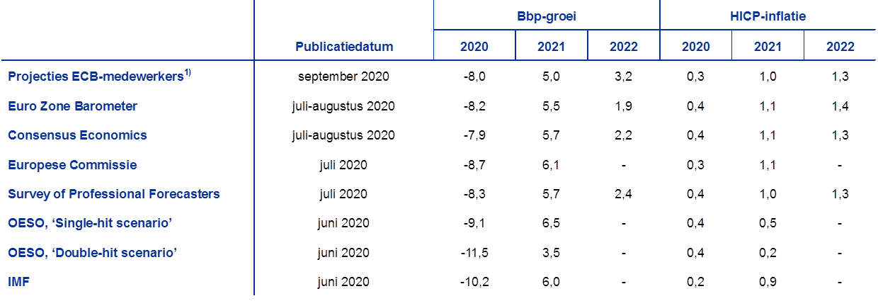 Bronnen: MJEconomics voor de Euro Zone Barometer, 17 augustus 2020, de gegevens voor 2022 zijn ontleend aan de enquête van juli 2020; Consensus Economics Forecasts, 14 augustus 2020, de gegevens voor 2022 zijn ontleend aan de enquête van juli 2020; (interim) economische zomerprognose van de Europese Commissie, 2020; Survey of Professional Forecasters van de ECB, enquête gehouden tussen 30 juni en 6 juli 2020; OESO, Economic Outlook 107, juni 2020. ‘Double-hit scenario’ verwijst naar een scenario met een tweede, minder hevige golf van het virus in het vierde kwartaal van 2020, terwijl in het ‘single-hit’-scenario de genomen maatregelen afdoende blijken om de huidige uitbraak de baas te kunnen. Beide scenario's zijn in de tabel opgenomen omdat de OESO beide even zwaar laat wegen en niet één basisscenario hanteert; IMF World Economic Outlook, 24 juni 2020.