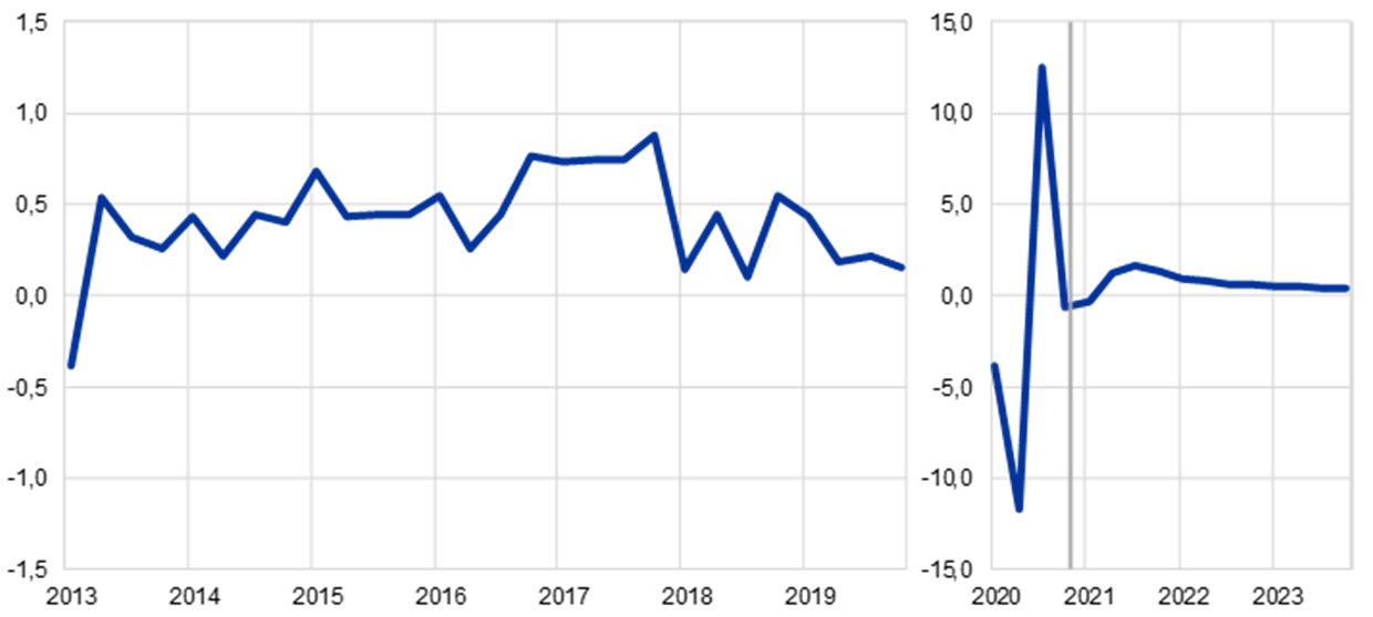 Poznámky: Vzhledem k nebývalé volatilitě reálného HDP v průběhu roku 2020 ukazuje graf od počátku roku 2020 údaje v jiném měřítku. Svislá čára označuje začátek horizontu projekcí. Tento graf nezobrazuje rozpětí kolem projekcí. To odráží skutečnost, že standardní výpočet rozpětí (na základě historických odchylek v projekcích) by za současných okolností nevyjadřoval spolehlivě bezprecedentní nejistotu spojenou se současnými projekcemi. Namísto toho jsou pro lepší ilustraci současné nejistoty uvedeny v části 5 alternativní scénáře založené na různých předpokladech týkajících se budoucího vývoje pandemie COVID-19 a souvisejících omezení.