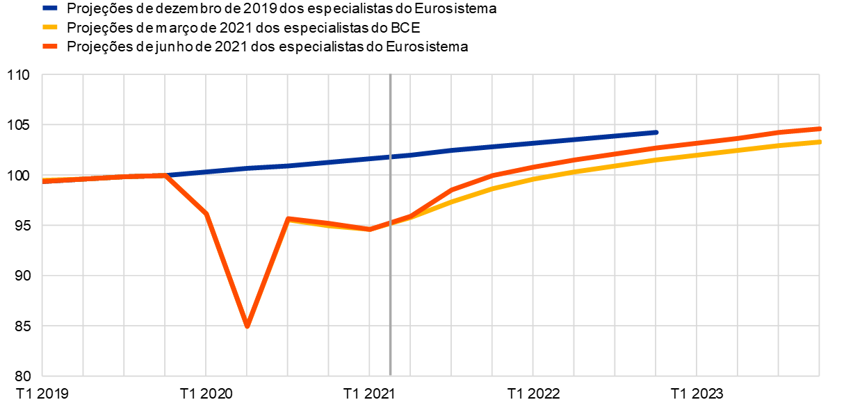 Notas: Os dados são corrigidos de sazonalidade e de dias úteis. Os dados históricos podem divergir das publicações mais recentes do Eurostat, devido à divulgação de dados após a data de fecho da informação para as projeções. A linha vertical indica o início do horizonte de projeção de junho de 2021.