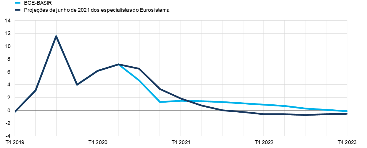 Notas: Ambas as linhas mostram o esperado desvio do rácio de poupança em relação à trajetória indicada nas projeções de dezembro de 2019 elaboradas por especialistas do Eurosistema, escolhida como a trajetória de referência anterior à pandemia. As projeções de dezembro de 2019 são alargadas até 2023, utilizando as taxas médias de crescimento do rendimento disponível nominal e do consumo privado a partir de 2022. No que respeita ao modelo BCE‑BASIR, as projeções de junho de 2021 são aplicadas até ao primeiro trimestre de 2021.