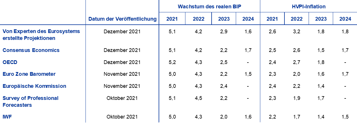 Die von Experten des Eurosystems erstellte Projektion vom Dezember 2021 für das Wachstum des realen BIP liegt für 2022 unter, für 2023 aber deutlich über denen anderer Prognostiker. Die Projektion bezüglich der Inflation hingegen liegt für 2022 deutlich über denen anderer Institutionen und für das Jahr 2023 am oberen Ende der Bandbreite. Die Projektion vom Dezember 2021 für das Wachstum im Jahr 2022 fällt niedriger aus als andere diesbezügliche Prognosen. Sie liegt aber nur geringfügig unter aktuelleren Projektionen, die die neuesten Informationen hinsichtlich der Verschärfung der Lieferengpässe und der Pandemie sowie der damit verbundenen Einschränkungen berücksichtigen. Eine kräftigere Erholung infolge der Bewältigung der Lieferengpässe kann teilweise als Erklärung für die höhere Projektion für das Wachstum im Jahr 2023 dienen. Was die Inflation betrifft, so sind die Projektionen vom Dezember 2021 für das Jahr 2022 höher als die anderen Prognosen. Dies lässt sich größtenteils durch die Berücksichtigung der HVPI-Daten vom November 2021 und die für die volatileren Komponenten erwartete höhere Inflation erklären. Sowohl hinsichtlich des Wachstums als auch der HVPI-Inflation sind die Unterschiede gegenüber anderen Prognosen für das Jahr 2024 begrenzt.