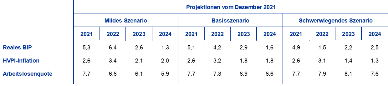 Im Vergleich zu den Projektionen vom September 2021 wurde das Wachstum des realen BIP für 2022 nach unten und für 2023 nach oben korrigiert. Die Abwärtskorrektur der kurzfristigen Aussichten, in der sich eine weitere Verschärfung der Lieferengpässe, höhere Energiepreise und strengere pandemiebedingte Einschränkungen widerspiegeln, führt zu einem statistischen Unterhang beim jährlichen Wachstum des realen BIP im Jahr 2022. Es wird davon ausgegangen, dass die Pandemie bewältigt wird und die Lieferengpässe allmählich wegfallen. Vor diesem Hintergrund wurde das vierteljährliche Wachstum für die Zeit ab dem zweiten Quartal 2022 nach oben korrigiert. Dadurch ergibt sich eine Aufwärtskorrektur des jährlichen Wachstums des realen BIP für 2023. Eine geringfügigere Straffung der Finanzpolitik und eine effektive Abwertung des Euro seit den Projektionen vom September 2021 haben zu den Aufwärtskorrekturen beigetragen, auch wenn diese Faktoren zum Teil durch den negativen Effekt höherer Ölpreise, einer schwächeren Auslandsnachfrage und höherer Langfristzinsen ausgeglichen wurden.