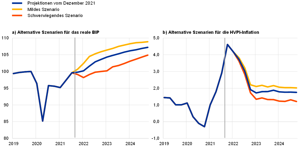Obwohl die HVPI-Inflation in den verschiedenen Szenarien kurzfristig nahezu identisch ist, würde sie im milden Szenario in den Jahren 2023 bis 2024 bei 2,0 % liegen. Im schwerwiegenden Szenario würde sie hingegen in den späteren Jahren des Projektionszeitraums deutlich zurückgehen (siehe Abbildung B). Beide Szenarien gehen davon aus, dass die Inflation aufgrund überwiegend temporärer Faktoren (einschließlich Basiseffekten, die höheren Energiepreisen und Lieferengpässen zuzuschreiben sind) im vierten Quartal 2021 ihren Höchststand erreicht. Danach sind allerdings Unterschiede zwischen den beiden Szenarien festzustellen, die auf die unterschiedlichen realwirtschaftlichen Bedingungen zurückzuführen sind. Insbesondere führt der von der angespannten Lage auf den Güter- und Arbeitsmärkten ausgehende starke Aufwärtsdruck im milden Szenario 2024 zu einem deutlichen Anstieg der zugrunde liegenden Inflation, während sie im schwerwiegenden Szenario in den Jahren 2023 bis 2024 gedämpft bliebe.