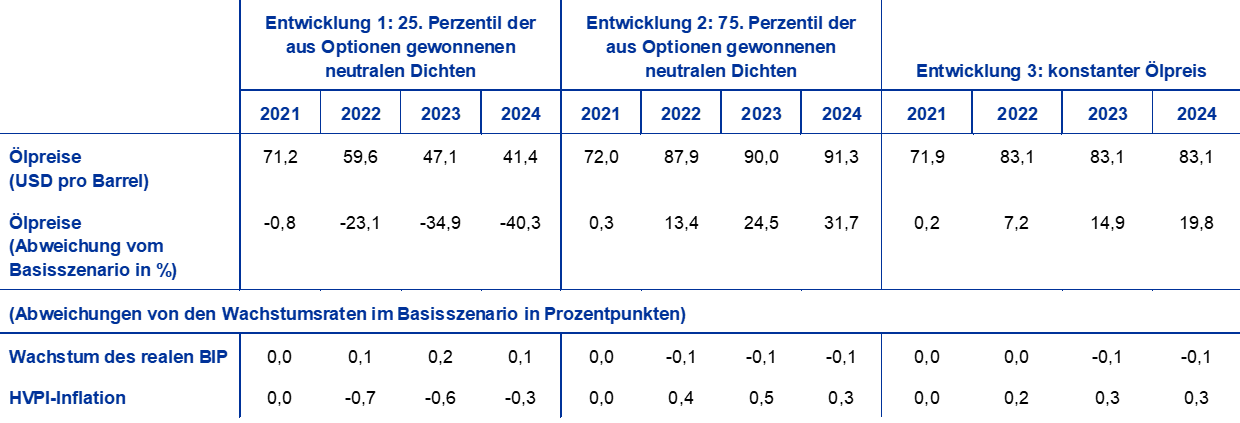 Mit der Sensitivitätsanalyse soll beurteilt werden, welche Implikationen divergierende Entwicklungen des Ölpreises hätten. Die technischen Annahmen für die Entwicklung des Ölpreises basieren auf den Terminpreisen für Öl. Es werden mehrere divergierende Ölpreisentwicklungen analysiert. Die erste basiert auf dem 25. Perzentil der Verteilung der Dichten, die aus Optionen für den Ölpreis am 25. November 2021 (dem Redaktionsschluss für die technischen Annahmen) gewonnen wurde. Diese Entwicklung impliziert einen allmählichen Rückgang des Ölpreises auf einen Wert, der etwa 40 % unter der im Basisszenario für 2024 geltenden Annahme liegt. Verwendet man den Durchschnitt der Ergebnisse einiger von Experten entwickelter makroökonomischer Modelle, so würde sich diese Entwicklung geringfügig positiv auf das Wachstum des realen BIP auswirken. Der dämpfende Einfluss auf die HVPI-Inflation fiele über den gesamten Projektionszeitraum hinweg stärker aus. Die zweite Entwicklung basiert auf dem 75. Perzentil derselben Verteilung und impliziert einen Anstieg des Ölpreises auf einen Wert, der etwa 32 % über der im Basisszenario für 2024 geltenden Annahme liegt. Diese Entwicklung würde das Wachstum des realen BIP sehr geringfügig belasten und hätte in den Jahren 2022 bis 2024 einen etwas stärkeren Aufwärtsdruck auf die HVPI-Inflation zur Folge. Die dritte Entwicklung basiert auf der Annahme, dass der Ölpreis zum Redaktionsschluss weiterhin das Niveau von 83,1 USD pro Barrel hält. Damit läge er bis 2024 etwa 20 % über der im Basisszenario für 2024 geltenden Annahme. Diese Entwicklung hätte 2023 und 2024 leicht negative Auswirkungen auf das Wachstum des realen BIP. Die HVPI-Inflation fiele hingegen 2022 bis 2024 0,2 bis 0,3 Prozentpunkte höher aus.