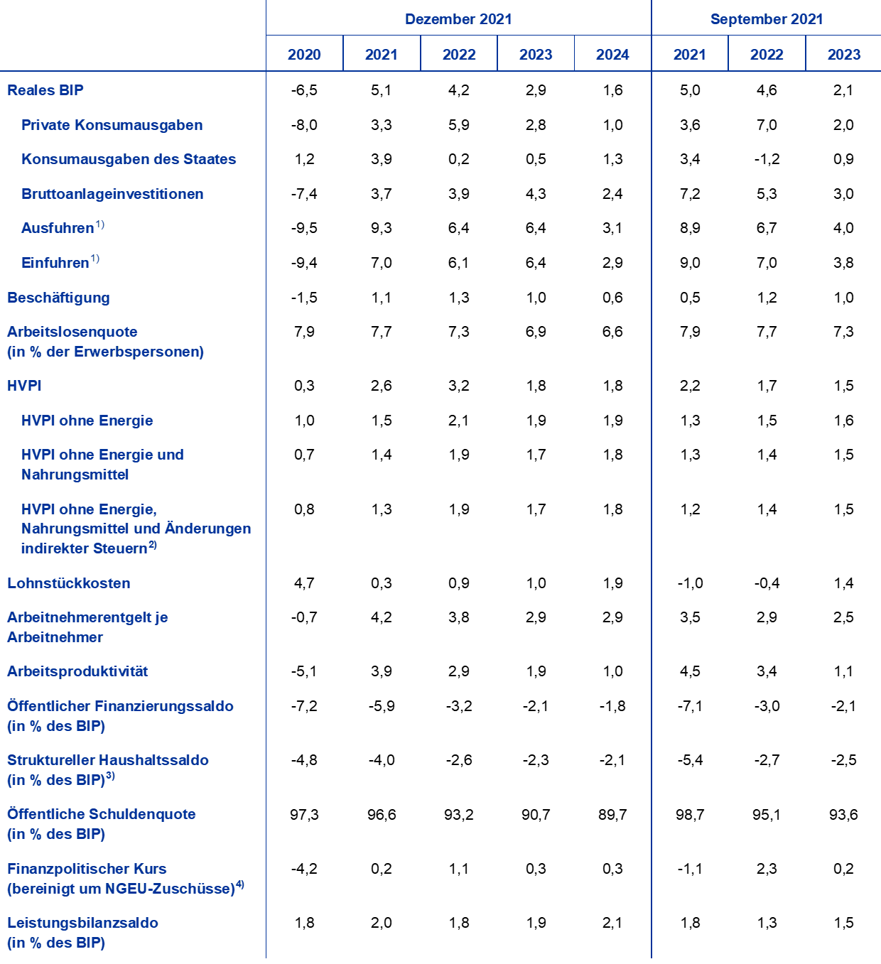 4) Die Messgröße für den finanzpolitischen Kurs ist die Veränderung des konjunkturbereinigten Primärsaldos nach Abzug der staatlichen Stützungsmaßnahmen für den Finanzsektor. Die abgebildeten Zahlen sind auch um die erwarteten NGEU-Zuschüsse auf der Einnahmenseite bereinigt. Eine negative Zahl impliziert eine Lockerung des finanzpolitischen Kurses.