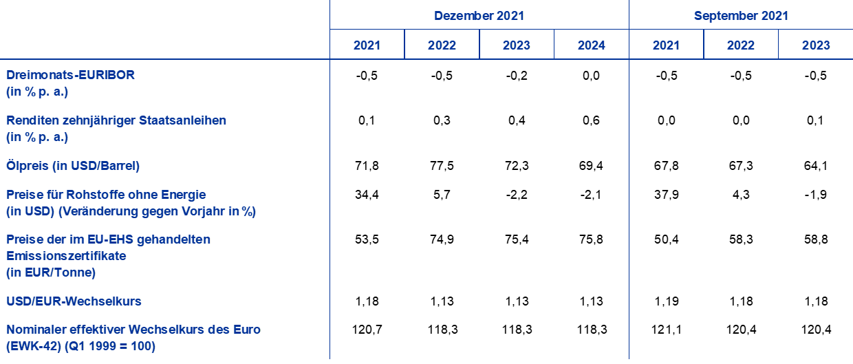 Im Vergleich zu den Projektionen vom September 2021 umfassen die technischen Annahmen höhere Zinssätze und Ölpreise sowie eine Abwertung des Euro. Die technischen Annahmen zu den Zinssätzen und Rohstoffpreisen beruhen auf den Markterwartungen; Redaktionsschluss war der 25. November 2021. Die Kurzfristzinsen beziehen sich auf den Dreimonats-EURIBOR, wobei die Markterwartungen von der Entwicklung der Terminkontrakte abgeleitet werden. Bei Anwendung dieser Methode ergibt sich für die Kurzfristzinsen ein Durchschnittsniveau von -0,5 % für 2021 und 2022, von -0,2 % für 2023 und von 0 % für 2024. Die Markterwartungen bezüglich der nominalen Renditen zehnjähriger Staatsanleihen im Euroraum implizieren ein durchschnittliches jährliches Niveau von 0,1 % für 2021, das über den Projektionszeitraum hinweg allmählich auf 0,6 % für 2024 ansteigt.[5] Gegenüber den Projektionen vom September 2021 haben sich die Markterwartungen bezüglich der Kurzfristzinsen für 2023 um 30 Basispunkte erhöht. Die Markterwartungen in Bezug auf die nominalen Renditen zehnjähriger Staatsanleihen im Euroraum für 2021 wurden geringfügig angehoben und haben sich für die Jahre 2022 und 2023 um 30 Basispunkte erhöht.