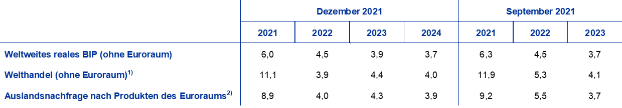 Die Projektionen gehen davon aus, dass die Weltwirtschaft ihren Erholungskurs trotz einiger, in naher Zukunft anstehender widriger Faktoren über den Projektionszeitraum hinweg beibehalten wird. Schätzungen zufolge wird das globale reale BIP (ohne Euroraum) 2021 um 6,0 % anziehen und sich 2022 auf 4,5 %, 2023 auf 3,9 % und 2024 auf 3,7 % abschwächen. Gegenüber den Projektionen vom September 2021 wurde die Projektion für das Wachstum im Jahr 2021 nach unten korrigiert. Neben dem bereits erwähnten Wiederanstieg der Covid-19-Infektionen belasten auch länderspezifische Faktoren das Wachstum. So dürfte beispielsweise das Profil der Staatsausgaben in den Vereinigten Staaten schwächer ausfallen als zuvor angenommen, insbesondere im dritten Quartal, und in China führten die Abkühlung im Wohnimmobiliensektor und Energieknappheit zu einem Rückgang des Wachstums. Aufgrund von länger andauernden Lieferengpässen wurden die Wachstumsprognosen der fortgeschrittenen Volkswirtschaften sowie einiger Schwellenländer (darunter China) für das Jahr 2022 nach unten korrigiert. Da die Erwartungen hinsichtlich des Wachstums einiger anderer Länder (vor allem für Indien und in geringem Maße auch für die Türkei) nach oben korrigiert wurden, bleibt die aggregierte Wachstumsrate aber unverändert. Das für 2023 projizierte Wachstum wurde insbesondere für die fortgeschrittenen Volkswirtschaften und vor allem für die Vereinigten Staaten nach oben korrigiert, denn es wird davon ausgegangen, dass die Lieferengpässe bis dahin vollständig behoben sein werden.