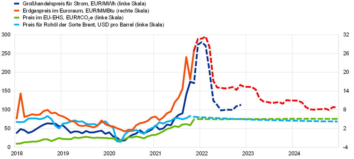 Bei den Rohstoffpreisen berücksichtigen die Projektionen die von den Terminmärkten anhand des Durchschnitts für den Zweiwochenzeitraum bis zum Redaktionsschluss am 25. November 2021 abgeleitete Entwicklung. Auf dieser Grundlage wird angenommen, dass der Preis pro Barrel Rohöl der Sorte Brent von 71,8 USD im Jahr 2021 auf 77,5 USD im Jahr 2022 ansteigt, bevor er bis 2024 auf 69,4 USD zurückgeht. Somit würden sich die auf US-Dollar lautenden Ölpreise gegenüber den Projektionen vom September 2021 im Jahr 2022 um 15 % und im Jahr 2023 um 13 % erhöhen. Die in US-Dollar gerechneten Preise für Rohstoffe ohne Energie dürften 2021 deutlich und 2022 etwas weniger stark anziehen und 2023 und 2024 leicht zurückgehen. Den auf Terminkontraktpreisen beruhenden Annahmen zufolge wird der Preis der im Emissionshandelssystem der EU (EHS) gehandelten Treibhausgasemissionszertifikate über den Projektionszeitraum hinweg bei rund 75 EUR pro Tonne liegen – eine Aufwärtskorrektur um fast 30 % seit den Projektionen vom September 2021 (siehe Kasten 3).