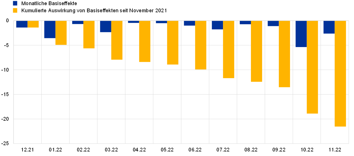 Anmerkung: Die monatlichen Basiseffekte geben den Beitrag des Basiseffekts zur monatlichen Veränderung der Jahreswachstumsrate der Inflation für Energie an. Die kumulierte Auswirkung von Basiseffekten wird als Summe der monatlichen Basiseffekte und stets im Verhältnis zu einem bestimmten Referenzmonat dargestellt. Beispielsweise sind rund 10 Prozentpunkte des Rückgangs der Inflationsrate für Energie im Juni 2022 gegenüber der entsprechenden Rate im November 2021 auf Basiseffekte zurückzuführen.