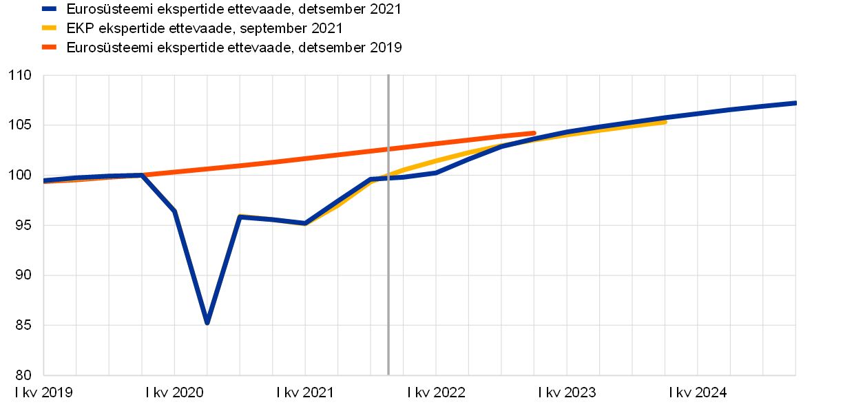 Lühiajalise loiduse järel peaks majanduskasv alates 2022. aasta teisest kvartalist jõuliselt hoogustuma ning aeglustuma siis 2023.–2024. aastal varasema keskmise taseme lähedal. Pikemaajalise elavnemise ootus põhineb eeldusel, et COVID-19 pandeemia hakkab järk-järgult lahenema ja selle majanduslik mõju väheneb, mis peaks leevendama seonduvat teadmatust ja suurendama kindlustunnet. Elavnemise aluseeldusteks on ka pakkumispoolsete kitsaskohtade järkjärguline vähenemine alates 2022. aasta teisest kvartalist, endiselt soodsad rahastamistingimused, suuremahuliste kogunenud säästude mõningane kahanemine ning maailmamajanduse praegune taastumine. 2023.–2024. aastal peaks SKP reaalkasv naasma mõõdukamale tasemele. ELi taasterahastu tõenäoliselt küll soodustab investeeringuid mõnes riigis, kuid muu eelarvepoliitika panus peaks 2021. aastaga võrreldes vähenema, ehkki on 2021. aasta septembri ettevaates prognoositust mõnevõrra suurem. Reaalse SKP näitaja peaks oma kriisieelse taseme ületama 2022. aasta esimeses kvartalis (st 2021. aasta septembri ettevaates prognoositust ühe kvartali võrra hiljem). Majanduskasvu prognoosi ülespoole korrigeerimine alates 2022. aasta teisest kvartalist aga suunab SKP näitaja 2022. aasta lõpuks 2021. aasta septembri ettevaates prognoositust kõrgemale ning see jääb kriisieelsetes ettevaadetes eeldatud tasemest ainult veidi madalamaks (vt joonis 2).