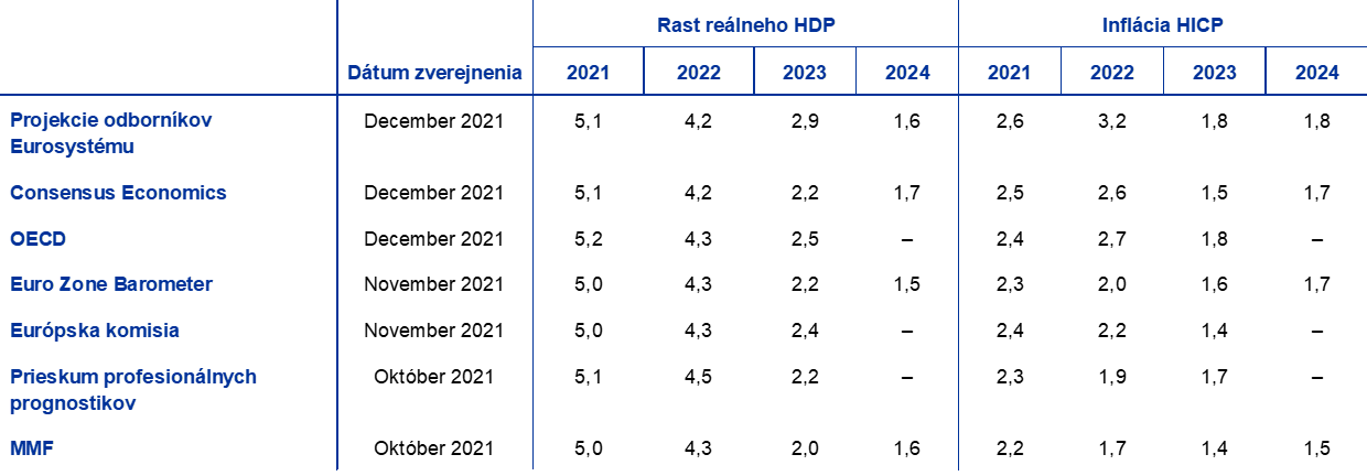 Zdroj: Consensus Economics Forecasts, 9. decembra 2021, údaje za roky 2023 a 2024 pochádzajú z prieskumu z októbra 2021; Hospodársky výhľad OECD, december 2021, č. 110; MJEconomics for the Euro Zone Barometer, 18. novembra 2021, údaje za roky 2023 a 2024 pochádzajú z prieskumu z októbra 2021; Hospodárska prognóza Európskej komisie z jesene 2021; ECB Survey of Professional Forecasters, za posledný štvrťrok 2021, prieskum vykonaný od 1. októbra do 11. októbra; Svetový hospodársky výhľad MMF, 12. októbra 2021.