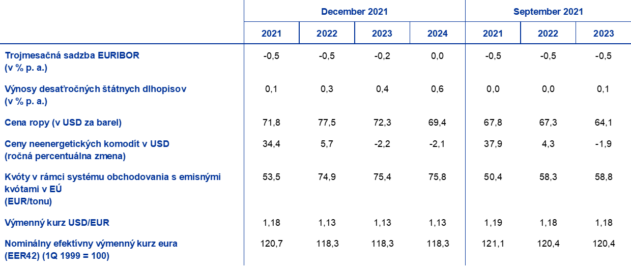 V porovnaní s projekciami zo septembra 2021 technické predpoklady zahŕňajú vyššie úrokové miery a ceny ropy, ako aj znehodnocovanie eura. Technické predpoklady týkajúce sa úrokových sadzieb a cien komodít vychádzajú z očakávaní trhu ku dňu uzávierky štvrtok, 25. novembra 2021. Krátkodobé úrokové miery vychádzajú z trojmesačnej sadzby EURIBOR, pričom trhové očakávania sú odvodené z úrokových mier futures. Na základe tejto metodiky by mala priemerná úroveň krátkodobých úrokových mier dosiahnuť -0,5 % v rokoch 2021a 2022, -0,2 % v roku 2023 a 0 % v roku 2024. Nominálne výnosy desaťročných štátnych dlhopisov v eurozóne by podľa očakávaní trhu mali dosiahnuť v priemere 0,1 % ročne v roku 2021 a počas sledovaného obdobia by sa mali postupne zvýšiť na 0,6% v roku 2024.[5] V porovnaní s projekciami zo septembra 2021 sú trhové očakávania krátkodobých úrokových mier na rok 2023 o 30 bázických bodov nižšie, zatiaľ čo trhové očakávania nominálnych výnosov desaťročných štátnych dlhopisov krajín eurozóny sú na rok 2021 mierne vyššie a na roky 2022 až 2023 sa zvýšili o približne 30 bázických bodov.