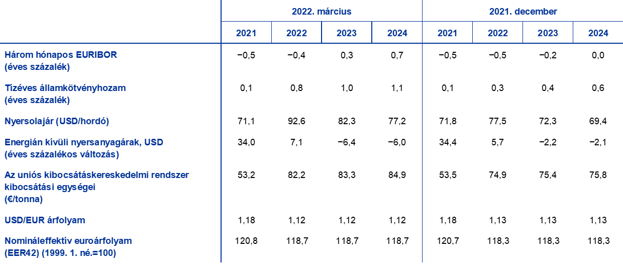 A bilaterális árfolyamok a feltevés szerint nem változnak az előrejelzési időszakban az adatgyűjtés zárónapját (2022. február 28.) megelőző három munkanapon uralkodó átlagos szinthez képest. Mindebből 2022–24 folyamán 1,12 USD/EUR átlagárfolyam következik, amely mintegy 1%-kal alacsonyabb a 2021. decemberi prognózisban szereplőnél. Az effektív euroárfolyamra vonatkozó feltevés 0,3%-os felértékelődéssel számol a decemberi prognózis óta.