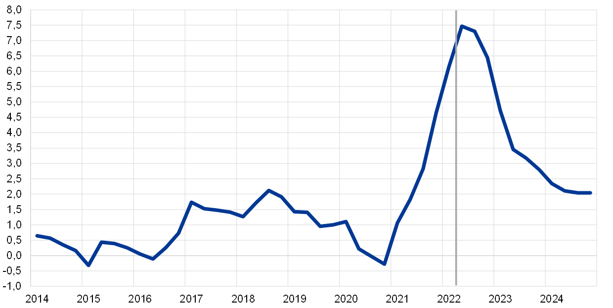 Efter at inflationen steg kraftigt i begyndelsen af 2022, er der udsigt til højere og mere vedvarende inflation. Den samlede HICP-inflation forventes stadig at være meget høj i størstedelen af 2022 med et gennemsnit på 6,8 pct.,[2] inden den gradvis aftager fra 2023 og nærmer sig ECB's inflationsmål i 2. halvår 2024. Prispresset vil fortsat være usædvanlig stort på kort sigt på grund af de høje olie- og gaspriser og stigninger i råvarepriserne på fødevarer, som er blevet kraftigt påvirkede af krigen i Ukraine, samt effekterne af genåbningen af økonomien og den globale forsyningsknaphed. Det forventede fald i inflationen til 3,5 pct. i 2023 og 2,1 pct. i 2024 afspejler primært en antagelse om mere afdæmpede råvarepriser på energi og fødevarer, hvis der ikke kommer yderligere stød, således som det kan udledes af futurespriserne. Desuden vil den igangværende normalisering af pengepolitikken, i det omfang den afspejles i højere renteantagelser (i overensstemmelse med markedets forventninger), bidrage til en mere afdæmpet inflation med den sædvanlige transmissionsforsinkelse. HICP-inflationen ekskl. energi og fødevarer vil fortsat være meget høj indtil udgangen af 2022. Derefter forventes den dog at falde, i takt med at det opadrettede pres fra genåbningen af økonomien, forsyningsflaskehalsene og presset fra omkostningerne til energiinput aftager. Den aktuelle økonomiske genopretning, stramningen af arbejdsmarkederne og visse virkninger af, at lønningerne – som forventes at stige langt mere end det historiske gennemsnit – kompenseres for den højere inflation, indebærer en høj underliggende inflation indtil slutningen af fremskrivningsperioden. Det antages dog i basisfremskrivningen, at inflationsforventningerne på længere sigt fortsat vil være fast forankrede. Sammenlignet med ECB's stabs marts 2022-fremskrivninger er inflationen blevet væsentlig opjusteret. Dette afspejler de seneste overraskende data, højere råvarepriser på energi og fødevarer, et mere vedvarende opadrettet pres som følge af forsyningsforstyrrelser, en kraftigere lønvækst og deprecieringen af eurokursen. Disse effekter mere end opvejer den nedadrettede effekt af stigningen i renteantagelserne og de svagere vækstudsigter.