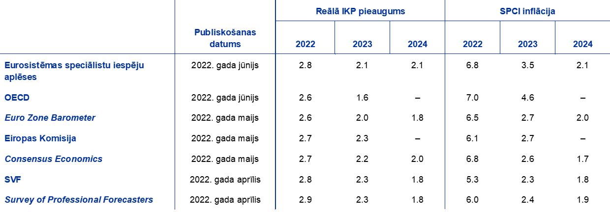 Avoti: OECD 2022. gada jūnija Tautsaimniecības perspektīvas Nr. 111, 2022. gada 8. jūnijs; MJEconomics for the Euro Zone Barometer, 2022. gada 26. maijs (2024. gada dati ņemti no 2022. gada aprīļa apsekojuma); Eiropas Komisijas 2022. gada pavasara tautsaimniecības prognozes, 2022. gada 16. maijs; Consensus Economics prognozes, 2022. gada 12. maijs (2024. gada dati ņemti no 2022. gada aprīļa apsekojuma); SVF Pasaules tautsaimniecības perspektīva, 2022. gada 19. aprīlis; ECB aptauja Survey of Professional Forecasters (2022. gada 2. ceturksnis), 2022. gada 15. aprīlis.