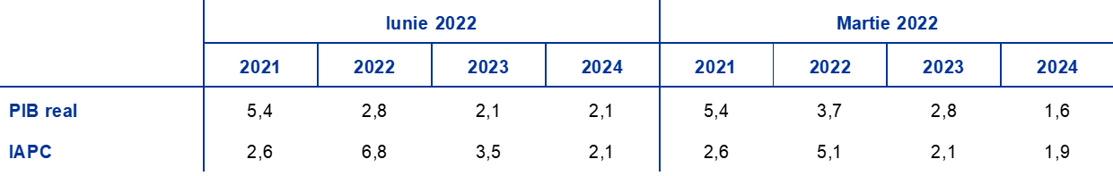 Comparativ cu proiecțiile din luna martie 2022, creșterea PIB real a fost revizuită în sens descendent cu 0,9 puncte procentuale pentru anul 2022 și cu 0,7 puncte procentuale pentru anul 2023 și în sens ascendent cu 0,5 puncte procentuale pentru 2024. Deteriorarea perspectivelor pentru 2022 reflectă, în mare măsură, impactul nefavorabil al războiului din Ucraina asupra prețurilor produselor energetice și ale alimentelor, asupra încrederii și asupra schimburilor comerciale. Revizuirea în sens descendent a creșterii PIB în 2023 este generată de efectul de report negativ din 2022, în timp ce revizuirea în sens ascendent pentru 2024 reflectă o revigorare a activității economice pe fondul disipării influențelor nefavorabile.