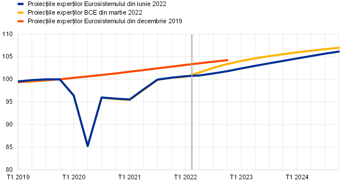 Dincolo de orizontul pe termen scurt, se anticipează o intensificare graduală a creșterii pe fondul disipării influențelor nefavorabile, deși se prevede că nivelul PIB va rămâne semnificativ mai scăzut pe tot parcursul orizontului de proiecție decât cel estimat în proiecțiile anterioare ale experților. Ameliorarea anticipată se bazează pe ipotezele potrivit cărora faza intensă a războiului din Ucraina se încheie până la sfârșitul anului 2022, impactul economic al pandemiei se reduce în continuare și tiparele de consum se normalizează, blocajele la nivelul ofertei sunt eliminate până la sfârșitul anului 2023 și dinamica exporturilor este sprijinită de îmbunătățirea competitivității prin preț față de principalii parteneri comerciali, precum Statele Unite, și de redresarea cererii externe. Se estimează că o inflație mai ridicată, amplificată de efectele războiului din Ucraina asupra prețurilor materiilor prime, va conduce la o scădere a veniturilor disponibile reale și va reduce valoarea reală a stocului semnificativ de economii acumulate în perioada pandemiei, frânând astfel consumul pe termen scurt. Pe termen mediu, scăderea ratelor inflației ar trebui să permită treptat reluarea creșterii veniturilor reale și să sprijine consumul. Efectele negative ale deteriorării încrederii și ale sporirii incertitudinilor, care încurajează economisirea în scop preventiv pe termen scurt, ar trebui, de asemenea, să se atenueze. După sprijinul considerabil acordat pentru activitatea economică de autoritățile guvernamentale pe tot parcursul crizei generate de pandemia de COVID-19 în perioada 2020-2021, precum și după creșterea investițiilor anticipate în 2022, finanțate prin programul „Next Generation EU (NGEU)”, și măsurile mai recente de susținere în contextul prețurilor ridicate ale produselor energetice și al războiului din Ucraina, se previzionează că politica fiscală va avea un impact negativ asupra creșterii în 2023, pe măsură ce unele dintre aceste măsuri sunt retrase. Se anticipează că poziția fiscală va rămâne mai puțin restrictivă la sfârșitul orizontului de proiecție, comparativ cu perioada prepandemie, având un efect pozitiv asupra nivelului PIB. În ansamblu, date fiind revizuirea în sens descendent a perspectivelor pe termen scurt și doar o redresare parțială anticipată pe termen mediu, nivelul PIB real este proiectat să se mențină, pe parcursul orizontului de proiecție, net inferior traiectoriei estimate în proiecțiile din luna martie 2022 (Graficul 2).