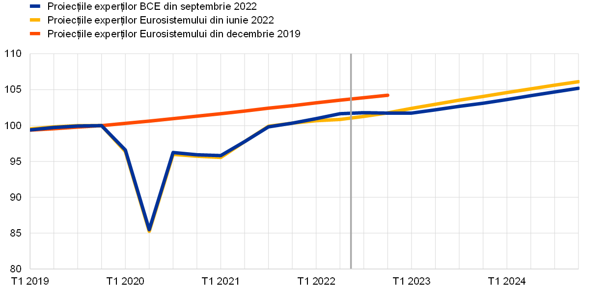 Comparativ cu proiecțiile din luna iunie 2022, creșterea PIB real a fost revizuită în sens ascendent cu 0,3 puncte procentuale pentru anul 2022 și în sens descendent cu 1,2 puncte procentuale pentru anul 2023 și cu 0,2 puncte procentuale pentru 2024. Revizuirea în sens ascendent pentru 2022 reflectă o expansiune peste așteptări a creșterii economice în semestrul I al anului, care este parțial anulată de revizuirea în sens descendent a creșterii economice în semestrul II, generată de incertitudinile ridicate, de scăderea încrederii, de intensificarea inflației, care comprimă veniturile reale, precum și de perturbările la nivelul ofertei de gaze naturale în contextul războiului din Ucraina. Acești factori explică, de asemenea, o revizuire destul de puternică în sens descendent a creșterii economice în trimestrul I 2023. Se consideră că dinamica trimestrială a PIB va începe să se redreseze începând cu trimestrul II 2023, deși într-un ritm mai lent decât s-a estimat în proiecțiile din luna iunie. Ușoara revizuire în sens descendent pentru 2024 reflectă caracterul persistent al șocurilor care au stat la baza revizuirilor în sens descendent pentru anul precedent, care împiedică o redresare mai rapidă a activității economice.