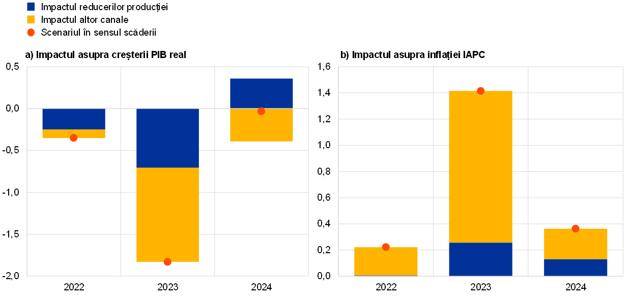 Având în vedere incertitudinile actuale asociate perspectivelor economice pentru zona euro ca urmare a războiului ruso-ucrainean, această casetă prezintă un scenariu în sensul scăderii. Acesta implică o întrerupere completă a livrărilor de gaze naturale din Rusia și de petrol pe cale maritimă în zona euro, existând puține posibilități de acces la surse alternative de aprovizionare cu gaze naturale. De asemenea, acesta presupune o majorare a prețurilor materiilor prime, un grad ridicat de incertitudine, o reducere a schimburilor comerciale și o deteriorare a condițiilor de finanțare comparativ cu proiecția de bază. Prin urmare, activitatea economică ar fi afectată de șocuri nefavorabile mai puternice și ar fi considerabil mai redusă decât în proiecțiile de bază, dinamica PIB pentru anul viitor fiind pronunțat negativă. Inflația ar fi mai ridicată, în special pe termen mediu (Tabelul A).