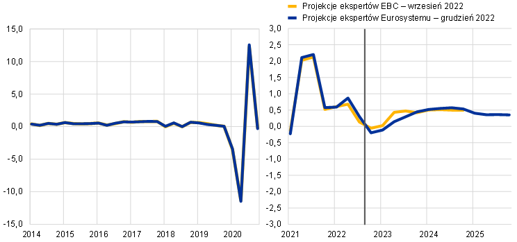 Uwagi: Dane historyczne mogą się różnić od najnowszych danych Eurostatu, których publikacja przypadła po dacie granicznej projekcji (zob. przypis 1). Pionowa linia wyznacza początek horyzontu bieżących projekcji.