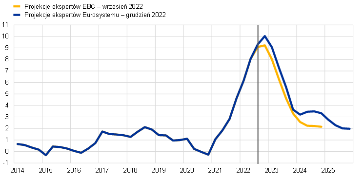 Projekcje ekspertów Eurosystemu z grudnia 2022 dotyczące zarówno dynamiki PKB, jak i inflacji w całym horyzoncie czasowym znajdują się bliżej górnej granicy lub powyżej innych prognoz. Projekcje ekspertów Eurosystemu dotyczące wzrostu gospodarczego na 2022 są nieco wyższe od pozostałych prognoz (prawdopodobnie z powodu uwzględnienia najnowszych rewizji w górę danych za pierwsze trzy kwartały roku), na lata 2023 i 2025 mieszczą się w ich przedziałach, natomiast na 2024 są najwyższe. Jeśli chodzi o inflację, projekcje ekspertów Eurosystemu na lata 2022 i 2023 mieszczą się w przedziałach pozostałych prognoz, a na 2024 i 2025 znajdują się bliżej górnej granicy lub powyżej tych przedziałów.