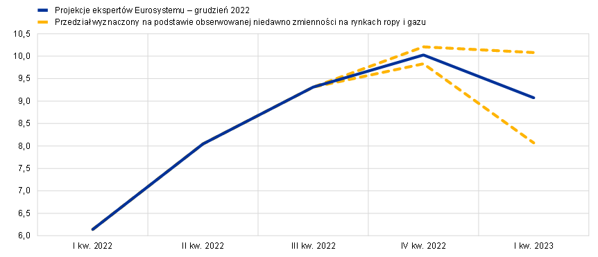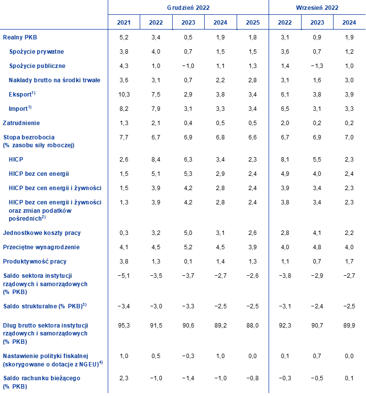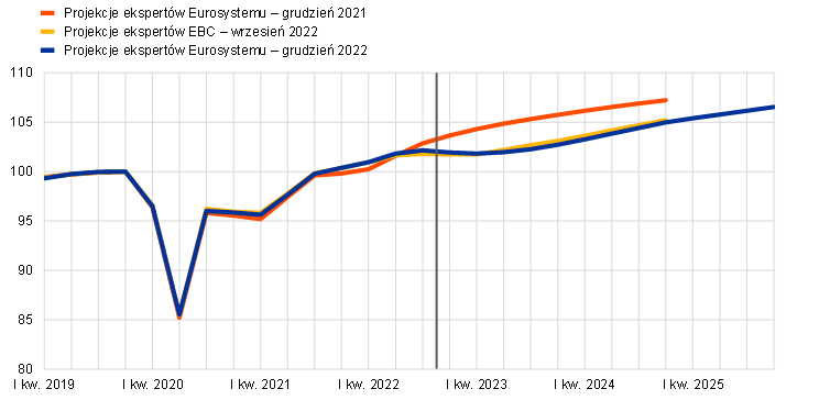 1. Datą graniczną dla założeń technicznych, w tym dotyczących cen ropy i kursów walutowych, był 23 listopada 2022. Projekcje dla gospodarki światowej sfinalizowano 24 listopada, zaś projekcje makroekonomiczne dla strefy euro – 30 listopada 2022. Projekcje ekspertów Eurosystemu dla strefy euro z grudnia 2022 uwzględniają Chorwację, która 1 stycznia 2023 przystępuje do strefy euro. Ten kraj jest także ujęty w danych historycznych dla strefy euro w odniesieniu do wszystkich zmiennych oprócz HICP. Obecna runda projekcji obejmuje lata 2022−2025. Projekcje o tak długim horyzoncie czasowym są obciążone bardzo dużą niepewnością, o czym należy pamiętać przy ich interpretacji. Zob. „An assessment of Eurosystem staff macroeconomic projections”, Monthly Bulletin, EBC, maj 2013. Na stronie http://www.ecb.europa.eu/pub/projections/html/index.pl.html są dostępne arkusze kalkulacyjne z danymi do niektórych tabel i wykresów. Na stronie https://sdw.ecb.europa.eu/browseSelection.do?node=5275746 jest dostępna baza danych obejmująca wszystkie dotychczasowe projekcje makroekonomiczne ekspertów EBC i Eurosystemu.