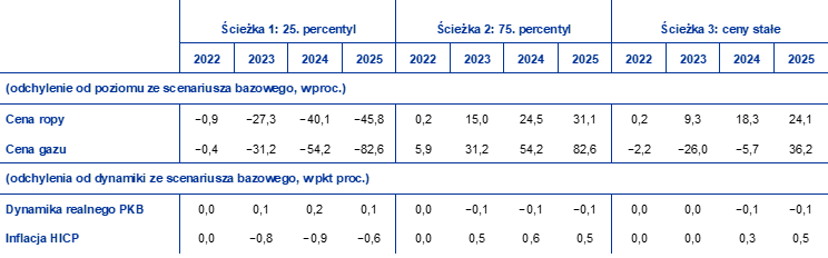 Skutki tych alternatywnych ścieżek ocenia się przy użyciu różnych modeli makroekonomicznych stosowanych w projekcjach przez ekspertów Eurosystemu i EBC. W poniższej tabeli przedstawiono w ujęciu średnim skutki dla dynamiki realnego PKB i inflacji uzyskane w tych modelach. Wyniki pokazują, że największe odchylenia w górę od bazowych projekcji inflacji HICP dotyczą 75. percentyla dla lat 2023–2025, co wskazuje, że inflacja HICP może być wyższa o 0,5–0,6 pkt proc. W scenariuszu opartym na ścieżce stałej wykazano mniejsze skutki w latach 2023–2024, ale podobne odchylenie w górę inflacji HICP w 2025. Natomiast w scenariuszu opartym na 25. percentylu inflacja HICP jest niższa o 0,8–0,9 pkt proc. w latach 2023–2024 i o 0,6 pkt proc. w 2025. Wpływ na dynamikę realnego PKB w przypadku ścieżki wyprowadzonej z 75. percentyla i założenia ceny stałej wynosi −0,1 pkt proc. zarówno w 2024, jak i w 2025, podczas gdy przy ścieżce opartej na 25. percentylu dynamika PKB jest wyższa: o 0,2 pkt proc. w 2024 i 0,1 pkt proc. w 2025.