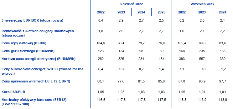W porównaniu z projekcjami ekspertów EBC z września 2022 założenia techniczne obejmują: wyższe stopy procentowe, niższe ceny ropy naftowej, znacznie niższe hurtowe ceny gazu i energii elektrycznej oraz aprecjację euro. Podstawą założeń technicznych dotyczących stóp procentowych i cen surowców są oczekiwania rynkowe; jako datę graniczną przyjęto 23 listopada 2022. Stopy krótkoterminowe opierają się na 3‑miesięcznej stawce EURIBOR, a oczekiwania rynkowe są wyprowadzane ze stawek kontraktów terminowych. Z tej metody wynika średni poziom krótkoterminowych stóp procentowych równy 0,4% w 2022, 2,9% w 2023, 2,7% w 2024 i 2,5% w 2025. Nominalna średnioroczna rentowność 10‑letnich obligacji skarbowych dla strefy euro wynikająca z oczekiwań rynkowych w 2022 wynosi 1,8%, po czym w horyzoncie projekcji stopniowo wzrasta i w 2025 osiąga 2,7%[4]. W porównaniu z projekcjami z września 2022 oczekiwania rynkowe dotyczące krótkoterminowych stóp procentowych zrewidowano w górę o ok. 20 pkt bazowych na 2022, 90 pkt bazowych na 2023 i 60 pkt bazowych na 2024, ze względu na spodziewane szybsze wycofanie bodźców monetarnych. To doprowadziło także do rewizji w górę rentowności długoterminowych obligacji skarbowych o ok. 20−50 pkt bazowych w horyzoncie projekcji.