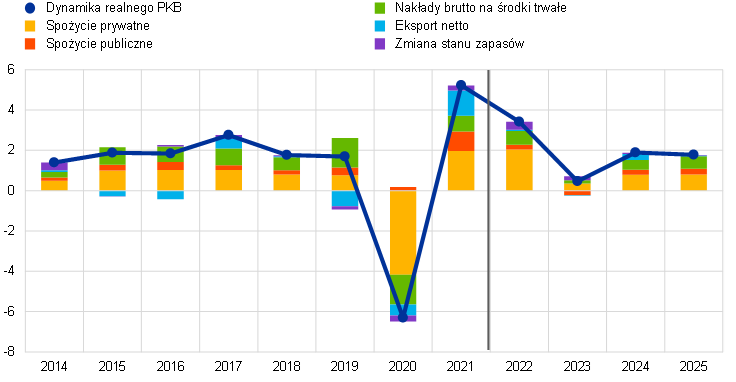 Uwagi: Dane odsezonowane i wyrównane dniami roboczymi. Dane historyczne mogą się różnić od najnowszych danych Eurostatu, których publikacja przypadła po dacie granicznej projekcji. Pionowa linia wyznacza początek horyzontu projekcji.