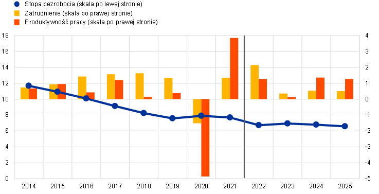 Rynek pracy ma w krótkim okresie pozostać odporny, a następnie kształtować się zasadniczo w zgodzie ze ścieżką aktywności gospodarczej (wykres 4). Po silnym wzroście w 2022 dynamika zatrudnienia w 2023 ma znacznie się obniżyć, co będzie wynikać z niższego popytu na pracę w związku ze spowolnieniem gospodarczym. Oczekuje się, że w krótkim okresie przedsiębiorstwa będą skracać czas pracy i jednocześnie zatrzymywać pracowników w warunkach wciąż znacznych niedoborów siły roboczej. Od 2024 zatrudnienie ma zasadniczo dotrzymywać tempa przewidywanej poprawie aktywności gospodarczej. W związku z tym oczekuje się, że dynamika produktywności pracy w przeliczeniu na jednego zatrudnionego gwałtownie spadnie z 1,3% w 2022 do 0,1% w 2023, po czym powinna odbić do 1,4% w 2024 i 1,3% w 2025. Stopa bezrobocia według projekcji wzrośnie w 2023 do 6,9%, a następnie będzie stale się obniżać i w 2025 wyniesie 6,6%.