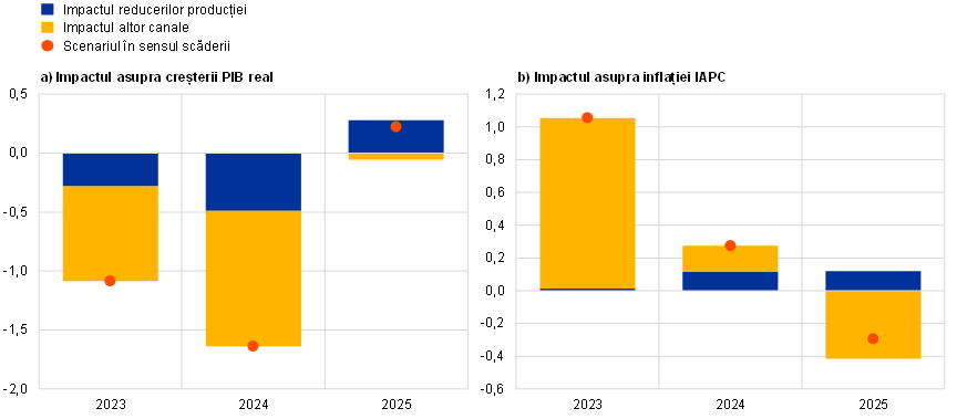 Comparativ cu scenariul în sensul scăderii publicat în contextul proiecțiilor macroeconomice ale experților BCE din luna septembrie 2022, o diferență esențială în actualul scenariu în sensul scăderii se referă la ipoteza unor deficite la nivelul ofertei de gaze naturale pentru următoarele două ierni, în timp ce în scenariul în sensul scăderii din septembrie 2022 s-a presupus că șocul principal va afecta economia în iarna 2022-2023. Aceasta conduce la efecte mai pronunțate atât asupra PIB, cât și asupra inflației IAPC, care, în scenariul actual, coboară sub nivelul proiecției de bază către finele orizontului de proiecție, ca urmare a deficitului considerabil de cerere agregată și a inversării unor ipoteze în perioada 2024-2025.
