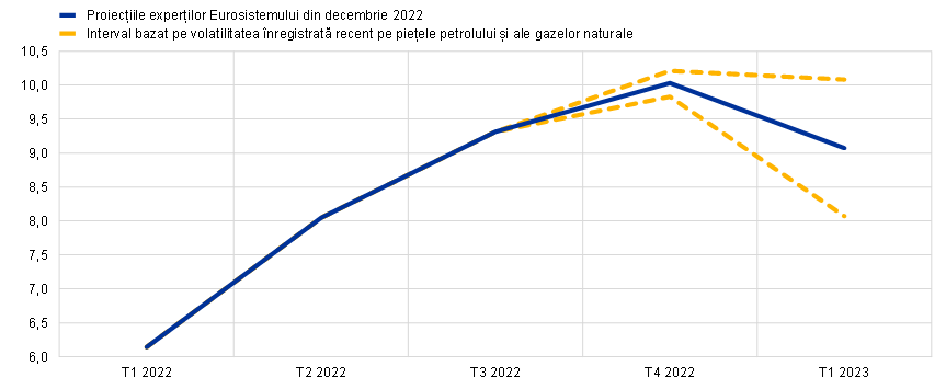 Volatilitatea ridicată actuală a prețurilor petrolului și, în special, a celor ale gazelor naturale a sporit semnificativ incertitudinile asociate perspectivelor inflației pe termen foarte scurt. Această volatilitate accentuată pe termen scurt nu este, de regulă, surprinsă de distribuția în jurul cotațiilor futures determinată pe baza prețurilor opțiunilor (a se vedea mai jos). O posibilitate de evaluare a acestei senzitivități pe termen scurt o reprezintă luarea în considerare a unui interval cuprins între limita superioară și cea inferioară a variațiilor pe termen scurt ale prețurilor petrolului și ale gazelor naturale, urmată de generarea unor prognoze privind inflația pe termen scurt pe baza acestui interval. În această analiză a senzitivității, intervalul stabilit pentru prețurile petrolului este cuprins între 60 USD și 120 USD/baril, iar cel pentru prețurile angro ale gazelor naturale, între 50 EUR și 200 EUR/MWh. Aceste prețuri, considerate a fi valabile în perioada decembrie 2022-martie 2023, sunt incluse în setul de ecuații energetice (pentru combustibili, energie electrică și gaze naturale) utilizat de experții BCE pentru prognozarea inflației pe termen scurt. Majorările maxime estimate ale prețurilor petrolului și ale gazelor naturale ar intensifica inflația IAPC totală cu 0,2 puncte procentuale în trimestrul IV 2022 și cu 1,0 puncte procentuale în trimestrul I 2023, comparativ cu proiecția de bază. Scăderile maxime estimate ale prețurilor petrolului și ale gazelor naturale ar avea un efect simetric, reducând inflația totală cu 0,2 puncte procentuale în trimestrul IV 2022 și cu 1,0 puncte procentuale în trimestrul I 2023.