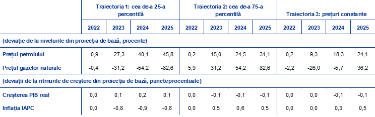 Pentru întregul orizont de proiecție, traiectorii alternative ale prețurilor produselor energetice sunt derivate din prețurile petrolului calculate folosind opțiuni, din erorile recente de prognoză aferente cotațiilor futures ale gazelor naturale și dintr-o traiectorie constantă a prețurilor. Traiectoria alternativă în sensul scăderii și cea în sensul creșterii se bazează pe cea de-a 25-a percentilă și pe cea de-a 75-a percentilă, care se referă la densitățile neutre implicite calculate folosind opțiuni pentru prețul petrolului la data de 23 noiembrie 2022 (data-limită pentru includerea ipotezelor tehnice). Această distribuție indică o relativă orientare în sensul scăderii. În absența unor distribuții similare pentru prețurile gazelor naturale, traiectoriile alternative sunt calculate pornind de la cea de-a 25-a percentilă și cea de-a 75-a percentilă a unei distribuții bazate pe erorile recente de prognoză aferente cotațiilor futures ale gazelor naturale. În plus, se ia în considerare o ipoteză privind prețuri constante atât pentru petrol, cât și pentru gazele naturale.