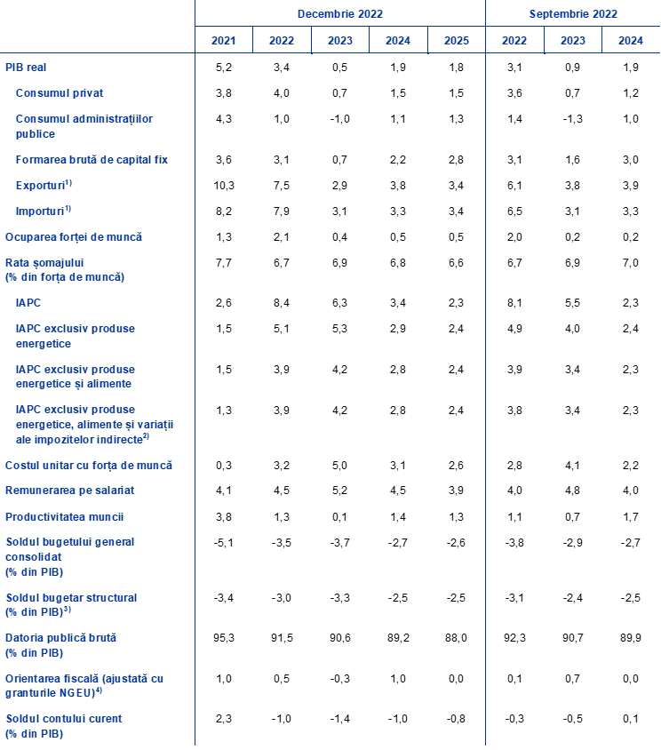 Comparativ cu proiecțiile din luna septembrie 2022, creșterea PIB real a fost revizuită în sens ascendent cu 0,3 puncte procentuale pentru anul 2022 și în sens descendent cu 0,4 puncte procentuale pentru anul 2023 și este nemodificată pentru 2024. Revizuirea în sens ascendent pentru 2022 reflectă rezultatele pozitive peste așteptări din trimestrele II și III, pe seama efectelor mai puternice decât cele anticipate ale redeschiderii postpandemice a economiei. Aceasta a fost numai parțial anulată de revizuirea în sens descendent din trimestrul IV 2022 generată de criza energetică și de incertitudinile ridicate asociate, de scăderea încrederii și de intensificarea inflației. Acești factori explică, de asemenea, revizuirile în sens descendent pentru primele trei trimestre ale anului 2023. Deși dinamica trimestrială a PIB este proiectată să înceapă să se redreseze din trimestrul II 2023, se consideră că ritmul acesteia va fi mai lent decât cel estimat în proiecțiile din luna septembrie 2022, ceea ce creează un efect de report negativ, care anulează complet dinamica mai robustă din cursul anului, conducând la absența unei revizuiri a creșterii anuale a PIB în 2024.