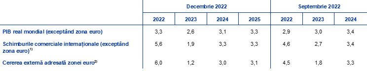 Conform proiecțiilor, dinamica globală va înregistra un ritm de creștere minim record în anul 2023, dar se va redresa progresiv ulterior. Se anticipează o încetinire pronunțată a creșterii PIB real mondial (exceptând zona euro) la 2,6% în 2023, nivel net inferior mediei sale pe termen lung (3,6%), și o intensificare a acesteia la 3,1% și, respectiv, 3,3% în 2024 și 2025. Această pierdere de ritm a economiei mondiale este generată cu precădere de principalele economii dezvoltate și de China. Se proiectează o temperare considerabilă a economiei SUA, ca urmare a înăspririi peste așteptări a condițiilor financiare, care frânează cheltuielile de consum și investițiile. Este probabil ca economia Regatului Unit să intre în recesiune, în condițiile în care consumul privat este afectat de prețurile ridicate de consum și de majorarea costurilor creditării. În ceea ce privește China, se estimează că, în 2022, creșterea PIB real nu va atinge ținta stabilită de autoritățile guvernamentale și se va menține, pentru restul orizontului de proiecție, net inferioară ritmurilor medii de creștere din perioada prepandemie. În Rusia, economia a intrat în anul 2022 într-o recesiune care a fost mai puțin severă decât s-a anticipat inițial, datorită reorientării exporturilor de petrol ale Rusiei către țările asiatice. Comparativ cu proiecțiile din luna septembrie 2022, ritmul de creștere a PIB real mondial (exceptând zona euro) a fost revizuit în sens ascendent pentru 2022 și în sens descendent pentru 2023 și 2024. Revizuirea în sens ascendent pentru 2022 reflectă cu precădere rezultate peste așteptări în trimestrul III în Statele Unite, China și Rusia. Reducerea creșterii economice în cadrul orizontului de proiecție se datorează în special Chinei și, în 2024, Statelor Unite.