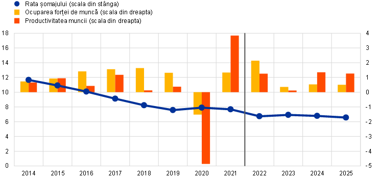 Conform proiecțiilor, piața forței de muncă va rămâne rezilientă pe termen scurt și va urma, în linii mari, traiectoria activității economice ulterior (Graficul 4). După o majorare puternică în 2022, se previzionează că dinamica ocupării forței de muncă se va reduce semnificativ în 2023, reflectând scăderea cererii de forță de muncă pe seama încetinirii creșterii economice. Pe termen scurt, se așteaptă ca firmele să ajusteze în sens descendent timpul de lucru, menținând totodată numărul de angajați pe fondul unor deficite încă semnificative de forță de muncă. Începând cu 2024, se estimează că ocuparea forței de muncă va ține, în linii mari, pasul cu ameliorările prevăzute ale activității economice. În consecință, dinamica productivității pe persoană ocupată ar trebui să înregistreze o scădere pronunțată de la 1,3% în 2022 la 0,1% în 2023. Aceasta ar trebui să se redreseze la 1,4% și 1,3% în 2024 și, respectiv, 2025. Conform proiecțiilor, rata șomajului va crește la 6,9% în 2023 și, ulterior, va scădea în mod continuu, ajungând la un nivel de 6,6% în 2025.