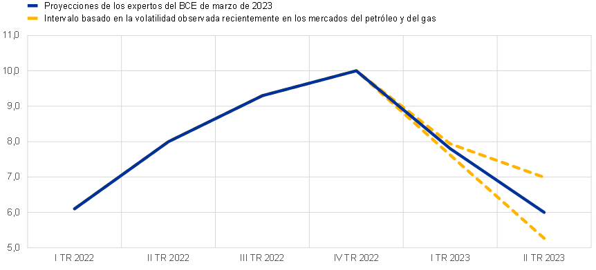 Sobre la base de la experiencia reciente, las trayectorias alternativas de los precios del petróleo y del gas implicarían que las perspectivas a corto plazo de la inflación medida por el IAPC podrían situarse en un intervalo entre el 5,3 % y el 7,0 % en el segundo trimestre de 2023. La elevada volatilidad a corto plazo observada el año pasado no suele reflejarse en la distribución implícita en las opciones sobre los futuros (que se analiza más adelante). Para analizar la sensibilidad a corto plazo, una posibilidad es considerar los límites superior e inferior para las variaciones a corto plazo de los precios del petróleo y del gas, y luego obtener previsiones sobre la inflación a corto plazo basadas en ese intervalo. Este análisis de sensibilidad considera que los precios del petróleo se situarán en un intervalo de entre 55 y 125 dólares estadounidenses por barril y los precios mayoristas del gas, entre 20 y 150 euros por MWh. Estos precios, que se estima que se mantendrán desde marzo de 2023 hasta junio de 2023, se incorporan a la serie de ecuaciones de la energía (de combustibles, electricidad y gas) utilizadas por los expertos del BCE para elaborar las proyecciones de la inflación a corto plazo. Las subidas máximas estimadas de los precios del petróleo y del gas elevarían la inflación medida por el IAPC general en 0,1 puntos porcentuales en el primer trimestre de 2023 y en 1,0 puntos porcentuales en el segundo trimestre de 2023, en comparación con la proyección de referencia. Los descensos máximos estimados de los precios del petróleo y del gas reducirían la inflación general en 0,2 puntos porcentuales en el primer trimestre de 2023 y en 0,7 puntos porcentuales en el segundo trimestre de 2023.