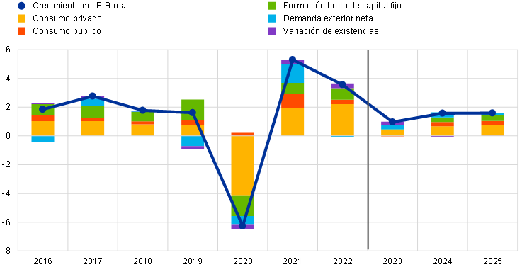 A partir del segundo semestre de 2023, se prevé que el crecimiento del PIB aumente debido al incremento de las rentas reales y al fortalecimiento de la demanda externa, si bien se verá atemperado por el endurecimiento de las condiciones de financiación, y siempre que disminuyan las actuales tensiones en los mercados financieros. Se prevé que el crecimiento se refuerce a lo largo de 2023 y se estabilice en el período 2024-2025, ligeramente por encima de la media histórica anterior a la pandemia. Ello refleja la resolución de los cuellos de botella en la oferta, aunque también la corrección de las perturbaciones de oferta, la mejora de la confianza y la disminución de la incertidumbre entre finales de 2022 y principios de 2023 relacionada con las futuras facturas de la energía. También se espera que el crecimiento se vea respaldado por la relajación de las presiones inflacionistas, lo que permitirá una recuperación de la renta real disponible y del consumo. Además, la demanda externa se fortalecerá en un contexto de precios de la energía mucho más bajos de lo previsto a escala mundial. No obstante, el impulso de estos factores favorables estará frenado por el endurecimiento de las condiciones de financiación —con unos tipos de interés más altos que también incentivan el ahorro de los hogares— y por la apreciación del euro, la retirada gradual del apoyo fiscal y la persistencia de la preocupación por el reequilibrio ordenado del mercado de la energía a medio plazo.