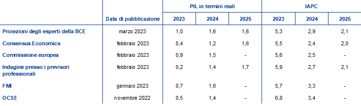 Le proiezioni di marzo degli esperti della BCE per la crescita del PIL si collocano al di sopra dell’intervallo di valori delle altre previsioni o sui livelli più elevati di tale intervallo nel periodo 2023-2024 e all’interno dello stesso per il 2025; con riferimento all’inflazione, risultano al di sotto dell’intervallo di valori delle altre previsioni per il 2023 ma all’interno dello stesso per il periodo successivo. Le proiezioni per la crescita del PIL formulate dagli esperti della BCE si collocano lievemente al di sopra dell’intervallo di valori delle altre previsioni per il 2023. Per il 2024 sono in linea con le proiezioni dell’FMI ma lievemente al di sopra delle altre previsioni, in particolare di quella di Consensus Economics, mentre per il 2025 sono simili a quelle degli altri analisti. Con riferimento all’inflazione, le proiezioni degli esperti della BCE si collocano al di sotto di tutte le altre previsioni per il 2023, molto probabilmente in quanto tengono conto del calo più recente dei prezzi dell’energia, e all’interno dell’intervallo di valori delle altre previsioni per il resto del periodo considerato.