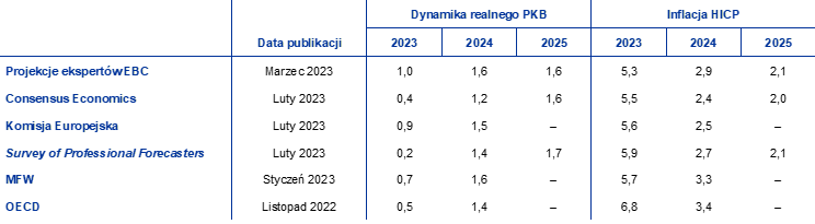 Projekcje ekspertów EBC z marca 2023 dotyczące dynamiki PKB na lata 2023–2024 znajdują się powyżej lub blisko górnej granicy przedziałów pozostałych prognoz, ale na rok 2025 mieszczą się w tych przedziałach. Natomiast projekcje dotyczące inflacji HICP na 2023 znajdują się poniżej przedziałów innych prognoz, lecz na późniejsze lata mieszczą się w tych przedziałach. Projekcje ekspertów EBC dotyczące dynamiki PKB na 2023 znajdują się nieznacznie powyżej przedziałów pozostałych prognoz, na 2024 są zgodne z projekcjami MFW, lecz nieco wyższe od pozostałych prognoz, zwłaszcza prognozy Consensus Economics, natomiast na 2025 są podobne do innych obliczeń. Jeśli chodzi o inflację HICP, projekcje ekspertów EBC na 2023 są poniżej wszystkich pozostałych prognoz, najprawdopodobniej ponieważ uwzględniają ostatnie spadki cen energii. Dla pozostałej części horyzontu projekcji mieszczą się w przedziałach pozostałych prognoz.