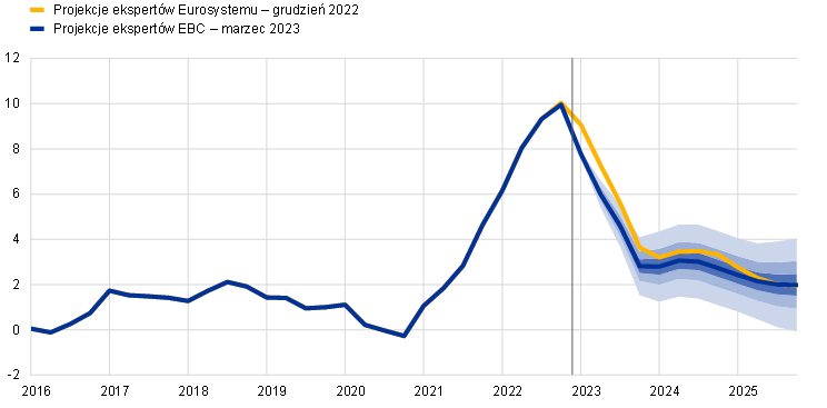 Inflacja ogółem w 2023 według oczekiwań znacznie się obniży, choć pozostanie podwyższona, pod wpływem ujemnego efektu bazy związanego z energią, spadków cen energii i coraz mniejszej presji cenowej. Do spadku inflacji ogółem powinna znacznie się przyczynić inflacja HICP cen energii, przede wszystkim z powodu dużego ujemnego efektu bazy wynikającego z silnego wzrostu cen surowców energetycznych w 2022 oraz stopniowego przekładania się zakładanych dużo niższych cen ropy, gazu i energii elektrycznej. Tym samym obniżenie się inflacji HICP cen energii w horyzoncie projekcji wynika ze spadków wszystkich jej głównych składowych (cen paliw transportowych, gazu i energii elektrycznej). Inflacja cen żywności według oczekiwań również wyraźnie spadnie wskutek zmniejszania się presji cenowej. Dynamika inflacji cen żywności nieprzetworzonej od jesieni ubiegłego roku słabnie w miarę zanikania presji na wzrost cen wynikającej z suszy w Europie. Jednocześnie presja cenowa w składowej obejmującej żywność przetworzoną nadal była znaczna, co w krótkim okresie jeszcze nasilało presję na wzrost inflacji cen żywności. Mimo to inflacja cen żywności w 2023 powinna się obniżyć dzięki stopniowemu zmniejszaniu się presji cenowej na ceny konsumpcyjne żywności wynikającemu z zakładanych malejących cen producentów rolnych, niższym cenom energii i innych czynników produkcji, a także ujemnemu efektowi bazy. Przewiduje się, że inflacja HICP z wyłączeniem cen energii i żywności w 2023 będzie stopniowo słabnąć, ponieważ zmniejszająca się presja cenowa ma przeważyć nad presją wzrostową wynikającą z coraz silniejszej dynamiki płac. W szczególności oczekuje się, że wzrostowa presja cenowa wynikająca z silnych podwyżek cen czynników produkcji i wcześniejszej deprecjacji euro zmniejszy się, do czego przyczynią się ujemny wpływ niedawnej aprecjacji euro i słabsze pośrednie oddziaływanie, biorąc pod uwagę zakładane dużo niższe ceny energii. Spodziewanemu w tym roku obniżeniu się inflacji HICP z wyłączeniem cen żywności i energii powinno sprzyjać ustępowanie presji wynikającej z wcześniejszych zatorów podażowych i efektów ponownego otwarcia gospodarki. Oczekuje się, że marże zysku, które wzrosły w 2022, także zaczną się obniżać wraz ze zmaterializowaniem się wpływu presji konkurencyjnej. Do spadku inflacji HICP z wyłączeniem cen energii i żywności początkowo przyczyni się inflacja cen nieenergetycznych towarów przemysłowych, natomiast inflacja cen usług będzie bardziej długotrwała z powodu silniejszej dynamiki płac i według oczekiwań pozostanie wysoka przez cały 2023 rok. Zmiany w wagach HICP w pierwszych miesiącach 2023 miały ujemny wpływ na inflację HICP z wyłączeniem cen energii i żywności, zaś w trzecim kwartale mają oddziaływać dodatnio, natomiast na inflację ogółem w całym 2023 roku powinny oddziaływać ujemnie.