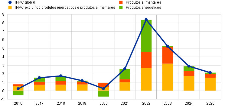 No médio prazo, a inflação medida pelo IHPC excluindo produtos energéticos e produtos alimentares deverá registar uma moderação, com a diminuição gradual das pressões acumuladas sobre os preços (para a qual contribuíram as recentes quedas dos preços dos produtos energéticos) e a transmissão da maior restritividade da política monetária à economia, ao passo que o crescimento historicamente elevado dos salários contribuirá para manter a inflação subjacente elevada. A esperada descida de 4,6% em 2023 para 2,2% em 2025 vem na sequência do desvanecimento do impacto em sentido ascendente dos estrangulamentos da oferta e dos efeitos da reabertura da economia, aliados aos efeitos desfasados do abrandamento do crescimento e da diminuição da intensidade dos efeitos indiretos da subida dos preços dos produtos energéticos. Não obstante a acentuada correção em baixa dos preços por grosso dos produtos energéticos implicar menores efeitos indiretos em comparação com projeções anteriores, estes preços permanecem elevados em termos históricos e só estão a ser transmitidos de forma gradual. Estima‑se, assim, que os efeitos líquidos ainda sejam positivos, mas diminuam no conjunto do horizonte de projeção. Do mesmo modo, as pressões em sentido ascendente sobre a inflação subjacente geradas pelos efeitos desfasados da anterior depreciação do euro são agora menores do que o anteriormente pressuposto, devido à recente apreciação do euro, que está relacionada, em parte, com a política monetária mais restritiva na área do euro. Ao mesmo tempo, o crescimento persistentemente elevado dos salários implicará uma inflação subjacente de 2,2% em 2025, muito acima da sua média histórica.