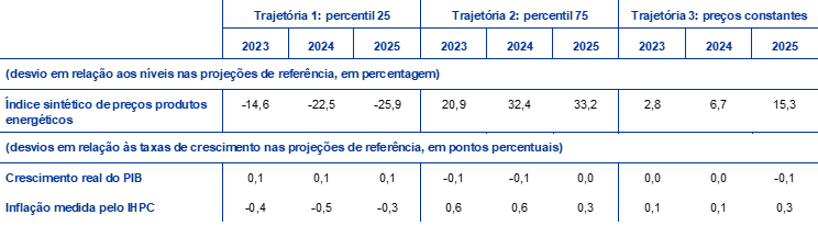 Os impactos destas trajetórias alternativas são avaliados recorrendo a uma série de modelos macroeconómicos de especialistas do Eurosistema e do BCE, com base num índice sintético de preços dos produtos energéticos. Os impactos médios no crescimento real do PIB e na inflação nos vários modelos são apresentados no quadro a seguir. Os resultados para os percentis 75 implicam desvios em alta, em relação às projeções de referência para a inflação medida pelo IHPC, de 0,6 pontos percentuais no período de 2023 a 2024 e de 0,3 pontos percentuais em 2025. O cenário assente na trajetória de preços constantes sugere impactos menores no período de 2023 a 2024, mas um desvio em alta semelhante em 2025 no que respeita à inflação medida pelo IHPC. Em contrapartida, no cenário assente no percentil 25, os impactos na inflação medida pelo IHPC são de ‑0,4, ‑0,5 e ‑0,3 pontos percentuais para 2023, 2024 e 2025, respetivamente. Os impactos no crescimento real do PIB são de ‑0,1 pontos percentuais em 2023 e 2024 para o percentil 75, ao passo que a trajetória do percentil 25 implicaria um crescimento do PIB 0,1 pontos percentuais mais elevado em cada ano do horizonte de projeção. O pressuposto de uma trajetória de preços constantes teria um impacto negligenciável no PIB no conjunto do horizonte de projeção.
