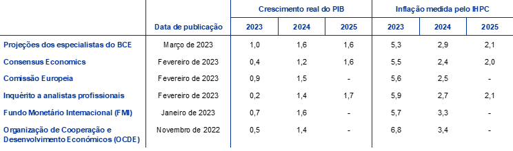 As projeções de março de 2023 elaboradas por especialistas do BCE para o crescimento do PIB situam‑se acima ou no limite superior do intervalo de outras previsões para o período de 2023 a 2024, mas dentro do intervalo para 2025, ao passo que a projeção para a inflação medida pelo IHPC se situa abaixo do intervalo de outras previsões para 2023, mas dentro do intervalo subsequentemente. A projeção dos especialistas do BCE para o crescimento do PIB situa‑se ligeiramente acima do intervalo de outras previsões para 2023. Para 2024, a projeção dos especialistas do BCE está em consonância com a projeção do FMI, mas encontra‑se pouco acima de outras previsões, em especial as previsões da Consensus Economics, ao passo que para 2025 é semelhante às outras previsões. No que respeita à inflação medida pelo IHPC, a projeção dos especialistas do BCE situa‑se abaixo das restantes previsões para 2023, muito provavelmente por ter em conta as descidas mais recentes dos preços dos produtos energéticos. Para o resto do horizonte, os valores projetados encontram‑se dentro do intervalo das outras previsões.