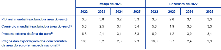 A data de fecho da informação para os pressupostos técnicos, como os relativos aos preços do petróleo e às taxas de câmbio, foi 15 de fevereiro de 2023. As projeções para a economia mundial foram finalizadas em 16 de fevereiro e as projeções macroeconómicas para a área do euro em 1 de março de 2023. Os dados históricos relativos à área do euro também incluem a Croácia para todas as variáveis, exceto o Índice Harmonizado de Preços no Consumidor. O presente exercício de projeção abrange o período de 2023 a 2025. Projeções com um horizonte tão alargado estão sujeitas a uma incerteza muito elevada, facto que é necessário ter em conta na sua interpretação. Ver o artigo intitulado “The performance of the Eurosystem/ECB staff macroeconomic projections since the financial crisis”, Boletim Económico, Número 8, BCE, 2019. Ver também a página dedicada do sítio do BCE (http://www.ecb.europa.eu/pub/projections/html/index.pt.html), para uma versão acessível dos dados subjacentes aos quadros e gráficos selecionados. É disponibilizada uma base de dados completa das projeções macroeconómicas anteriores elaboradas por especialistas do BCE e do Eurosistema em: https://sdw.ecb.europa.eu/browseSelection.do?node=5275746.