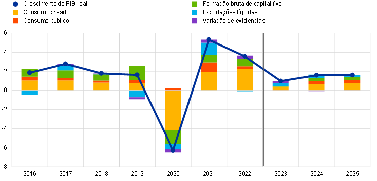 A partir do segundo semestre de 2023, projeta‑se que o crescimento do PIB aumente com a subida dos rendimentos reais e o fortalecimento da procura externa, ainda que atenuado pela maior restritividade das condições de financiamento, e sob a condição de as atuais tensões nos mercados financeiros abrandarem. O crescimento deverá ganhar força ao longo de 2023 e, em 2024 e 2025, estabilizar ligeiramente acima da média histórica anterior à pandemia. Tal reflete a resolução dos estrangulamentos da oferta, mas também a dissipação dos choques sobre a oferta, a melhoria da confiança e o desvanecimento, em torno da viragem do ano de 2022 para 2023, da incerteza relacionada com faturas energéticas futuras. O crescimento deverá também ser apoiado pela atenuação das pressões inflacionistas, permitindo uma recuperação do rendimento disponível real e do consumo. Além disso, a procura externa ganhará força, num contexto de preços mundiais dos produtos energéticos muito inferiores aos anteriormente projetados. Não obstante, o ímpeto destes fatores favoráveis será abrandado pela maior restritividade das condições de financiamento – com as taxas de juro mais elevadas também a incentivar a poupança das famílias – e pela apreciação do euro, pela cessação gradual do apoio orçamental e pelas preocupações ainda persistentes quanto um reequilíbrio regular do mercado de produtos energéticos no médio prazo.